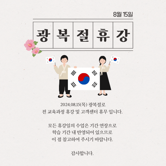 | 다음글 ▲ | 추석 연휴 휴강 안내 | 관리자 | 2024-09-09 | 2877 |