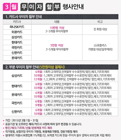 | 이전글 ▼ | 2015년 2월 무이자 할부 행사안내 | 관리자 | 2015-02-23 | 10067 |